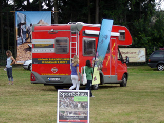 Auf dem Gelände um den Showring waren an beiden Tagen Verkaufs- und Infostände aufgebaut. Wer Freude an Gemälden, und Skulpturen hatte kam genauso auf seine Kosten wie jemand der gerne einen Imbiss aus biologisch angebauten Salaten und Gemüse essen wollte. Viele Familien aus den Nachbarorten, mit Kindern und unglaublich vielen Hunden, nutzten diese Veranstaltung für einen gemeinsamen Ausflug. Auch dafür war von den Veranstaltern vorgesorgt. Bald liefen die Kinder mit kunstvoll geschminkten Gesichtern herum. Am Sonntag wurden die Temperaturen zunehmend kühler und so saßen wir zusammen mit unseren Sloughis in Decken gehüllt auf den Zuschauerbänken. Glück hatte, wer mit rotem Spielmobil unterwegs war...