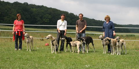 Da wir eine größere Gruppe Sloughis, in den verschiedenen Farben und Typen, zeigen wollten, schlossen sich uns noch Liz Gross von Hübbenet und Marietta Heil an. Somit konnten wir 8 Sloughis aus 3 verschiedenen Zuchtstätten + 2 Sloughis aus einem der Ursprungsländer, dem interessierten Publikum präsentieren. So konnten wir Sloughis in den Farben Sand mit und ohne Maske und Sandfarben mit schwarzem Mantel im Alter zwischen 5 Monaten und knapp 12 Jahren zeigen. Vom Nuri al Baida Kennel waren V’Fanannya, X’Dahri, Y’Jalajala und Amal Hayati zu sehen. Der Kennel Dau al Gamar wurde durch die Therapiehündin Azali vertreten. Iqbal Rafik el Amen vertrat unseren Kennel. Ergänzt wurde die Vorstellung durch die beiden aus Tunesien importierten Sloughis Kahla und Srab.