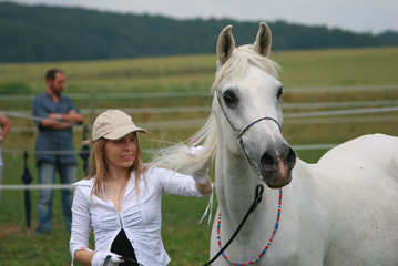 Nach der Mittagspause wurden die Zuchtstuten des Gestütes gezeigt. Hier konnte man die ganze Typenvielfalt des rein ägyptischen Vollblutarabers bestaunen. Sehr interessant war auch die Tatsache, dass sie fast überwiegend aus alten bzw. seltenen Linien entstammen. Zu nennen wären da z. B. die wundervolle aus den USA importierte Stute MPA Amiri Alani – eine der letzten Töchter des „Egyptian Prince“. Trotz ihres Alters von 22 Jahren zeigte sie sich frisch im Freilauf. Auch ihre Tochter Authentic Aisha und deren sehr hoffnungsvolles Hengstfohlen Aqib aus diesem Jahr wurden gezeigt. So konnte man in einem Schaubild drei Generationen sehen. Zu sehen war auch die 23 jährige Fuchsstute Asasi Bint Maraa. Sie wurde ebenfalls in den USA gezogen und gehört zu den wenigen Rasmoniet Nachkommen in Europa. Sie ist eng auf die Stute Moniet el Nefous gezogen und steht ganz in deren Typ. Weiterhin war die im alten Typ stehende Stute UP Fatima zu sehen, ein Halbschwester des bekannten kürzlich verstorbenen Hengstes Classic Shadwan der Familie Escher. UP Fatima wurde in den Hamdan Stables in Ägypten gezogen und ist die unangefochtene Herrscherin des Gestütes Roter Ball.